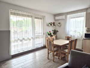 A lakás tökéletes lokációval rendelkezik, a falu központjában, mégis csendes belső udvarban található. A tájolása is elsőosztályú, így a lakás egész nap világos.