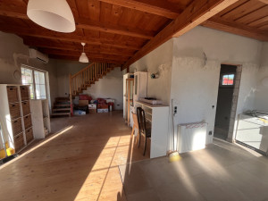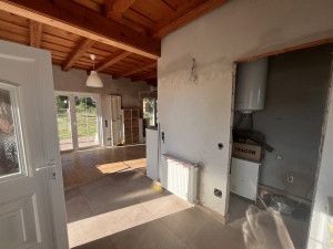A házba belépve egy amerikai konyhás nappaliba érünk. Onnan nyílik egy háztartási helység, itt kapott helyet a gázkazán és a bojler. A gázkazán bár új, nem Magyarországról hozott, így nem sikerült beüzemelni, így a gázfűtéshez egy új kazánra van szükség.