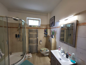 Itt található az egyik fürdőszoba zuhanyzóval és WC-vel, valamint a néhány éve cserélt kondenzációs gázkazán és az új kémény. A 17 m²-es TERASZ a nappaliból nyílik, elektromos napellenzővel, így nyáron is kellemes a hőérzet.