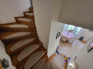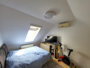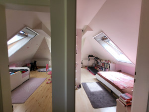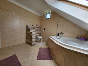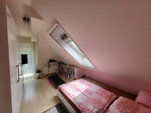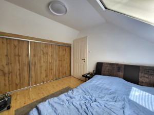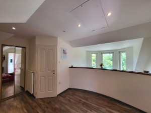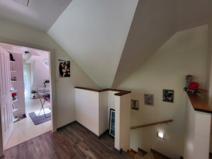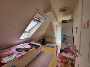 Az emeletre egy kényelmes, biztonságos lépcső vezet fel. Itt három külön bejáratú, kényelmes szoba vár, amelyek közül kettő ERKÉLYKAPCSOLATOS – ez ritka és rendkívül praktikus. A hatalmas, kádas fürdő külön WC-vel, illetve a gardrób és egy egyedileg tervezett közlekedő igazán egyedivé teszi ezt a szintet.