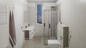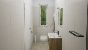 A földszinti fürdőszobában egy zuhanyzó, mosdó és 60x115 cm-es paraméterekkel rendelkező törölközőszárítós radiátor kapott helyet.