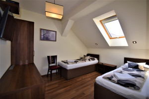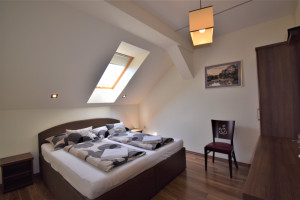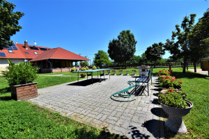 Panzió: 20 fő magas színvonalú elhelyezésére biztosít lehetőséget az következő elosztásban: 6 db kétágyas szoba, 2 db franciaágyas szoba és egy családi lakosztály egy kétágyas és egy franciaágyas szobával.