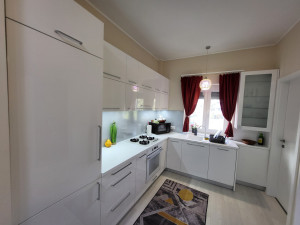 A konyha modern, teljesen felszerelt – beépített hűtő-fagyasztóval, sütővel, gáztűzhellyel és mosogatógéppel –, így tényleg csak be kell költöznöd, és már főzheted is az első vacsorát.