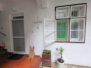 - A lakás egy 2 szint (2 emelet magas) magas, liftnélküli téglaépület földszintjén található. Lépcsőzni nem kell, így szinte akadálytalanul meg lehet közelíteni a bejáratot. Egy közös használatú kis udvarról nyílik.