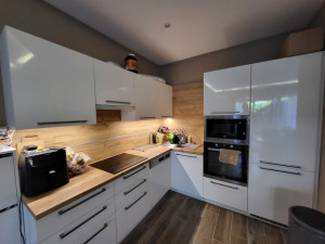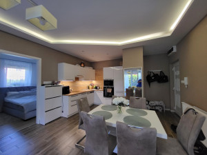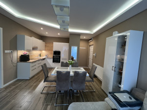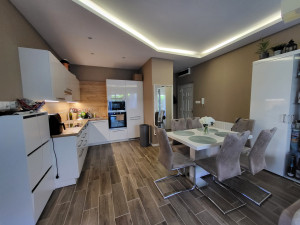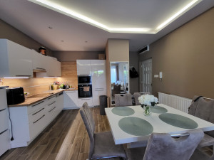 A gépesített konyha nemcsak esztétikus, hanem praktikus is – minden kézre áll, az étkező pedig akár 6-8 fő számára is kényelmes.