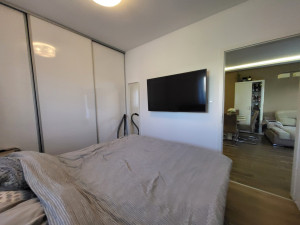 A 12 m²-es hálószoba igazi menedék: egy teljes falat betöltő beépített szekrénnyel, ami elegánsan elrejti a mindennapi apróságokat.