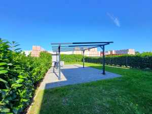A kert közepén egy 60 m²-es térkövezett pihenőterület található, 5×5 méteres alumínium pergolával és szerszámtárolóval – tökéletes hely egy nyári grillvacsorához, baráti összejövetelhez vagy egy csöndes délutáni pihenéshez.
