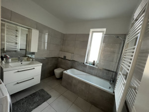 A fürdőszoba (8 m²) a modern lakások egyik mintapéldája – kád, üvegparaván, zuhanyzási lehetőség, mosó- és szárítógépnek kialakított hely, plusz extra beépített szekrények teszik tökéletessé.