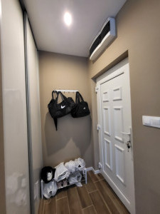 Az előszoba (3,5 m²) is maximálisan kihasznált, beépített szekrénnyel és akasztókkal.