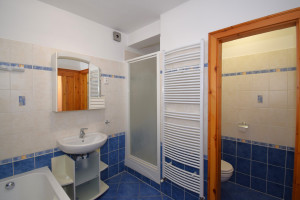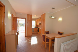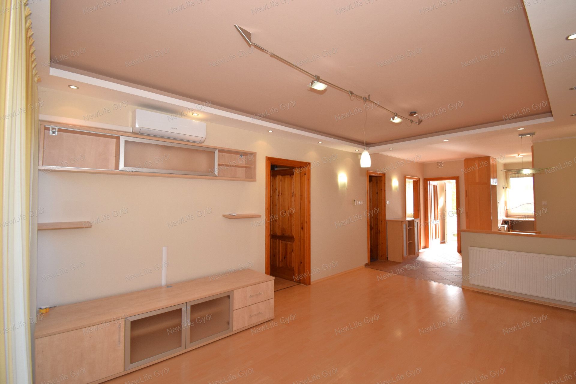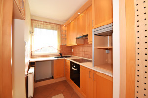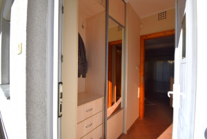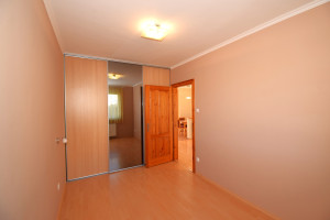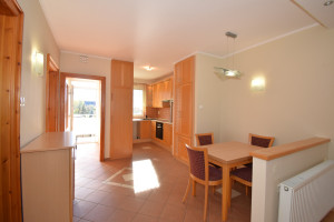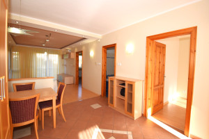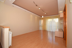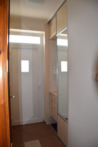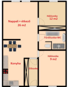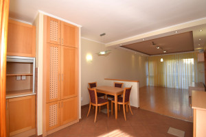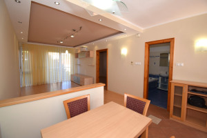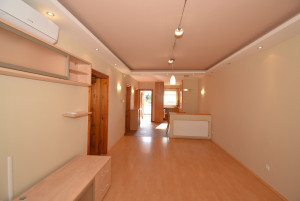 Elosztása: előszoba, konyha étkezővel, nappali, fürdőszoba zuhanyzóval, káddal és WC-vel és két hálószoba.  Az egyik hálószobában és az előszobában is nagy beépített szekrények segítik a tárolást. A lakás vételár része a fotókon látható nappali bútor és komód. Nappali fölött álmennyezet látható beépített spotlámpákkal.