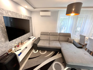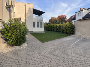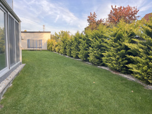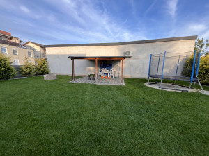 A lakás egy négylakásos társasház magasföldszintjén helyezkedik el. A négy lakás közösen használja a zárt udvarban lévő csodásan gondozott kertet, amely gyönyörűen parkosított. Lehetőség van a fedett teraszon akár sütögetni, vagy mellette az erre a célre kialakított részen bográcsozni. A kertrészen egy közös trambulin is a gyerekek rendelkezésére áll.
