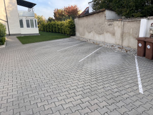 A lakáshoz tartozik egy udvari beállóhely, illetve egy dupla, saját garázs, így mindösszesen három autó tárolására van lehetősége az ingatlan tulajdonosának.